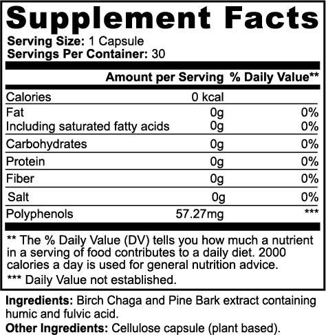 Ingredients: Birch Chaga and Pine Bark extract containing humic and fulvic acid, Cellulose Capsule (plant-based).